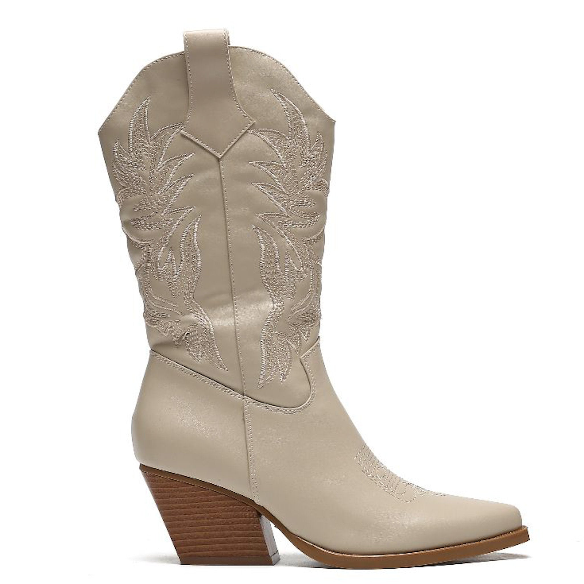 Beige imitatieleren cowboylaarzen voor dames. Laarzen met beige stiksels afgewerkt met bruine zool. Verkrijgbaar in maat 36 t/m 41. Instaprits aan binnenzijde. Met deze westernlaarzen maak je je outfit helemaal compleet.