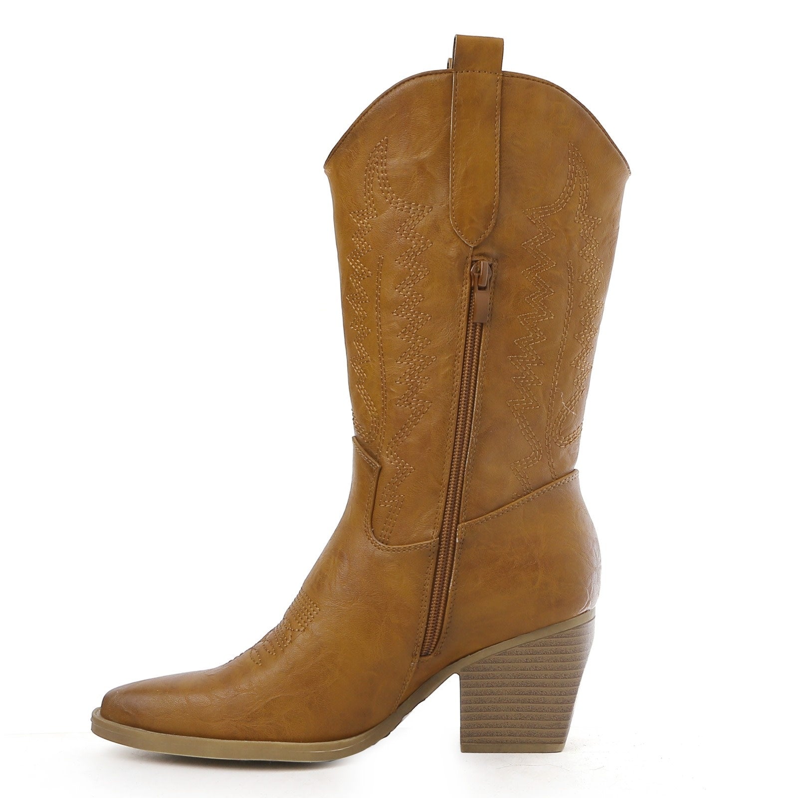 Camel imitatieleren cowboylaarzen voor dames. Laarzen met stiksels afgewerkt met bruine zool. Verkrijgbaar in maat 36 t/m 41. Instaprits aan binnenzijde. Met deze westernlaarzen maak je je outfit helemaal compleet.