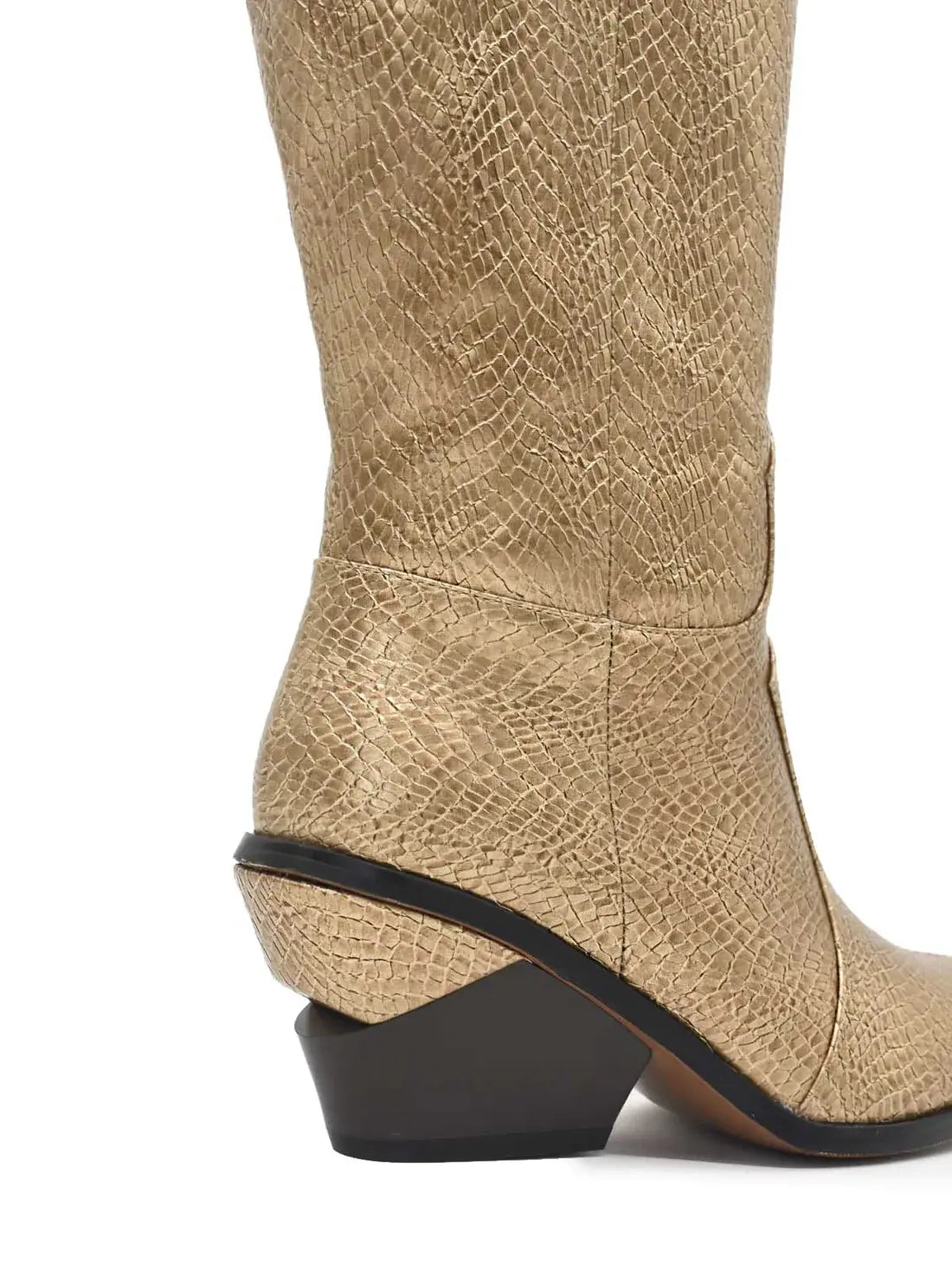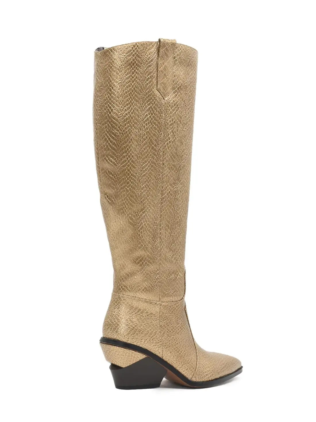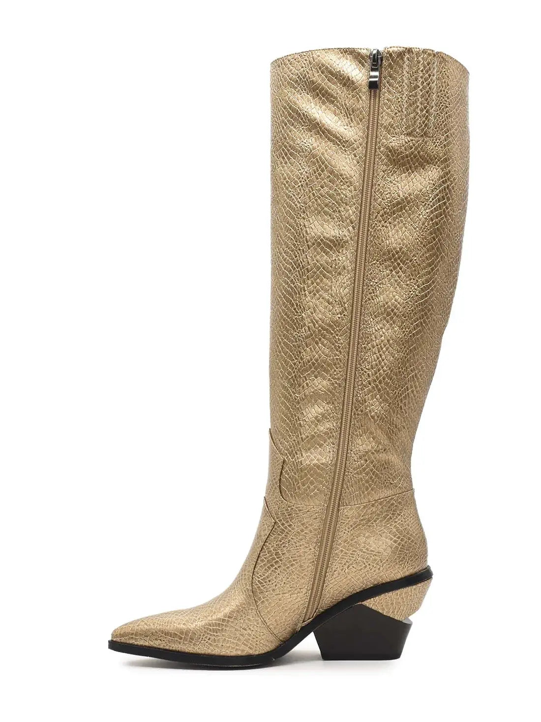 Trek de aandacht met deze goudkleurige laarzen met slangenprint.