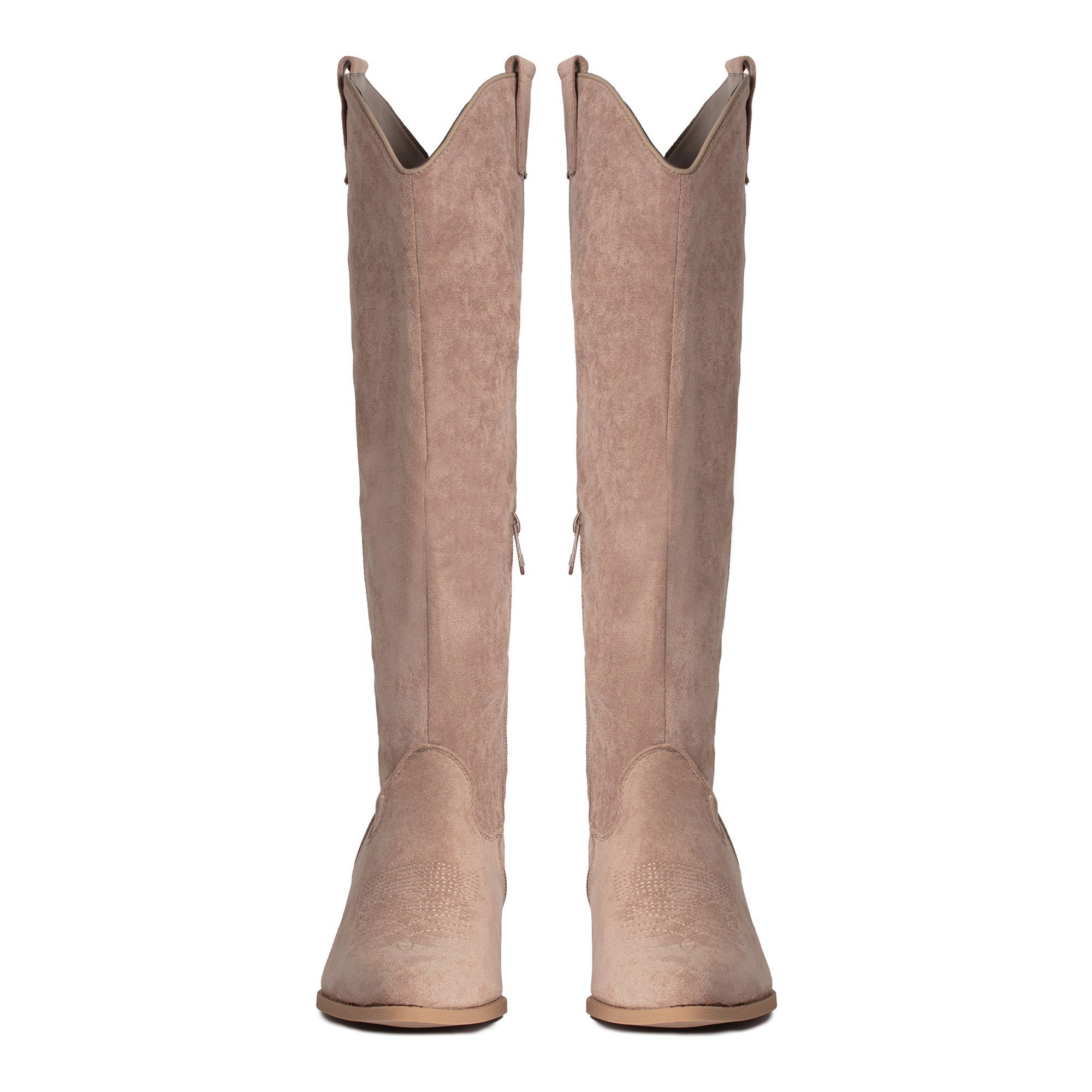 Hoge khaki suedine cowboylaarzen voor dames. Trendy laarzen afgewerkt met zwarte zool. Verkrijgbaar in maat 36 t/m 41. Instaprits aan binnenzijde. Met deze musthave hoge cowboy boots is je outfit helemaal af.