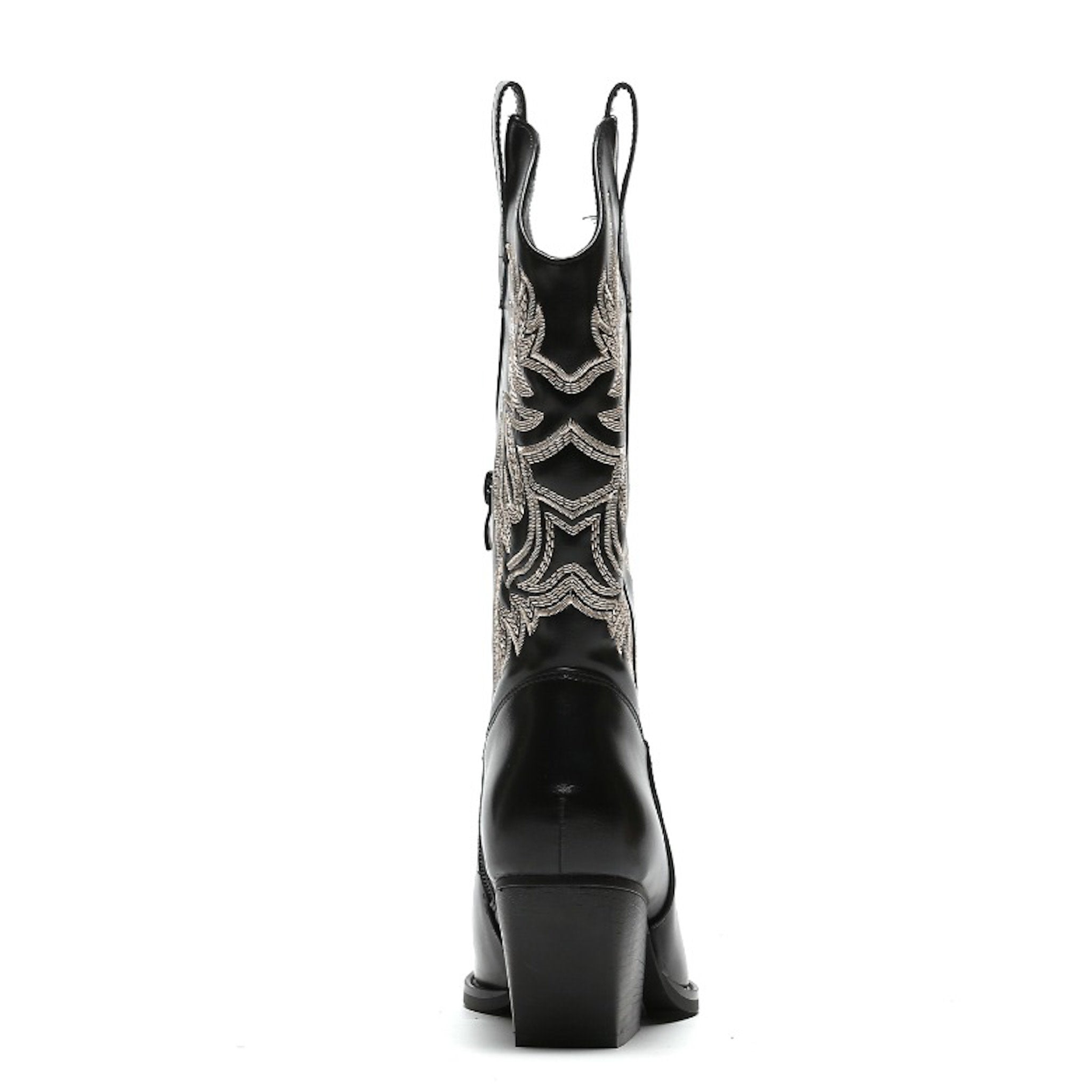 Zwart imitatieleren cowboylaarzen voor dames. Laarzen met beige stiksels afgewerkt met zwarte zool. Verkrijgbaar in maat 36 t/m 41. Instaprits aan binnenzijde. Met deze westernlaarzen maak je je outfit helemaal compleet.