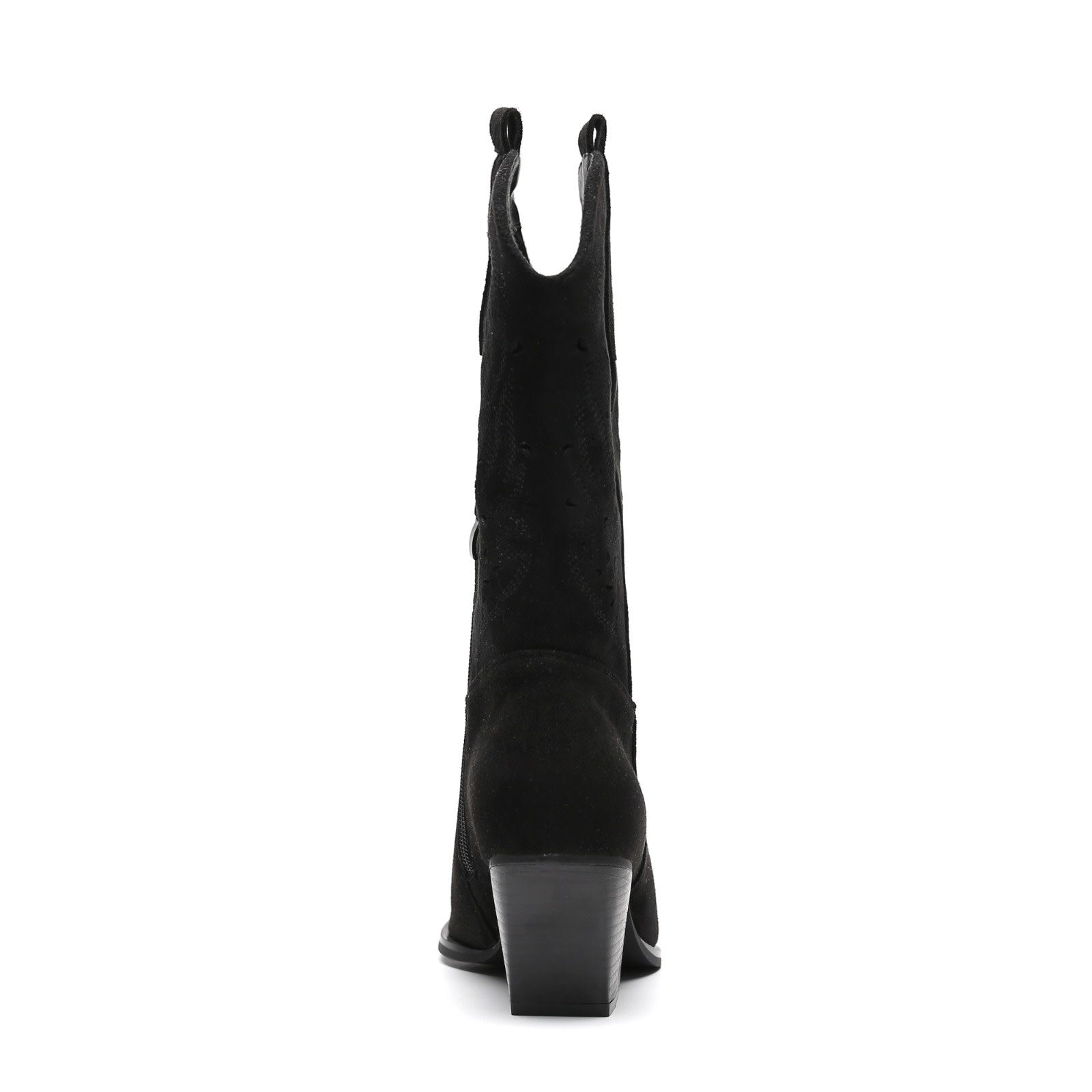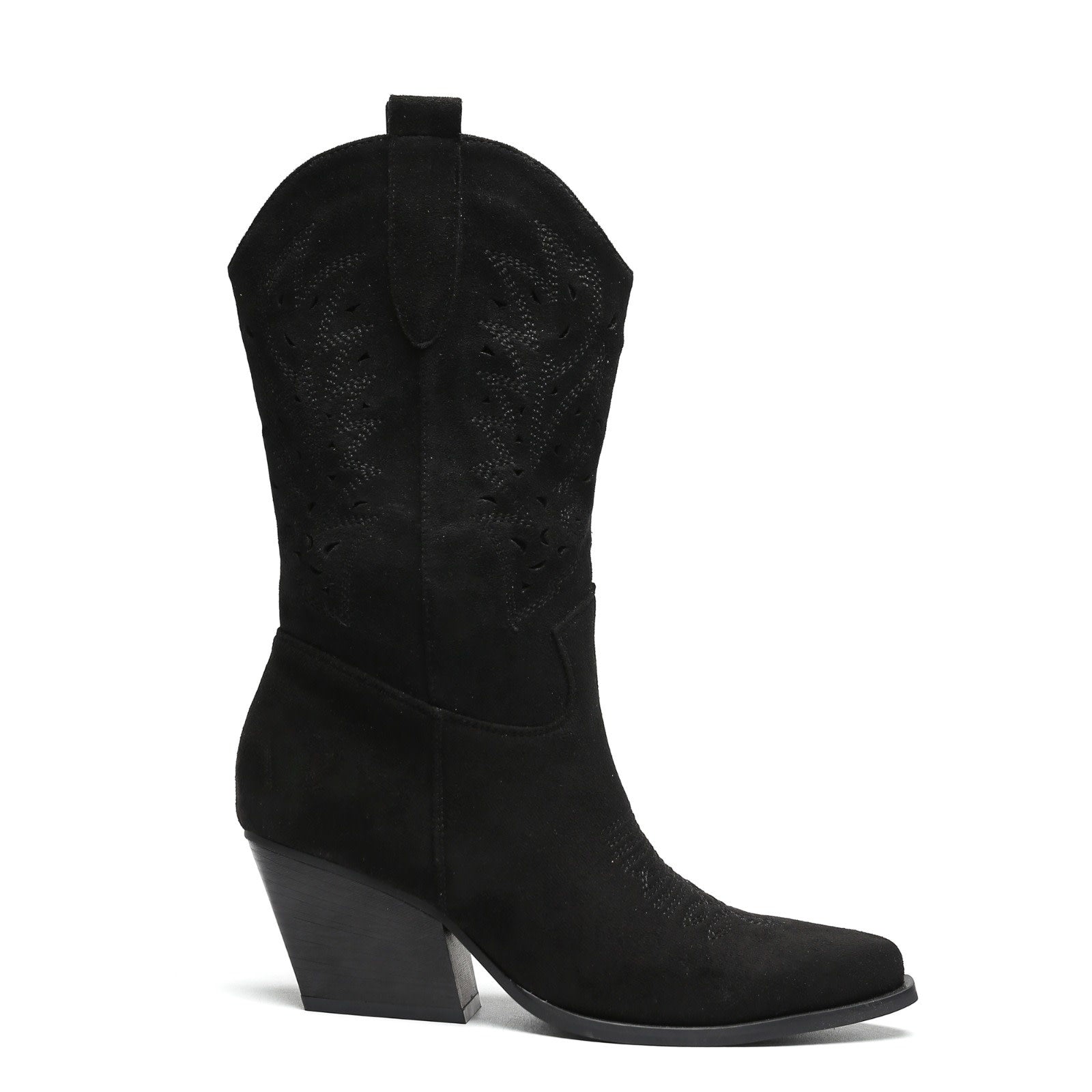 Zwart kleurige suedine Cowboylaarzen in gave western look. Verkrijgbaar in maat 36 t/m 41. Met instaprits aan de binnenzijde.