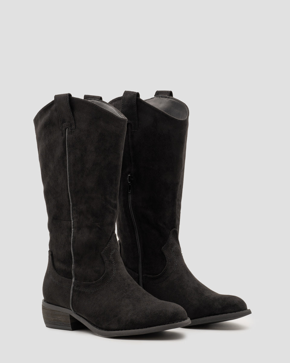 Zwart suedine basic cowboylaarzen. De laarzen hebben een platte zool met lage hak van 4 cm en een perfecte pasvorm. Deze cowboy boots zijn ideaal voor iedere gelegenheid. Verkrijgbaar in maat 36 t/m 41. Met instaprits aan de binnenzijde.