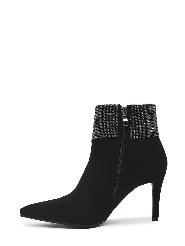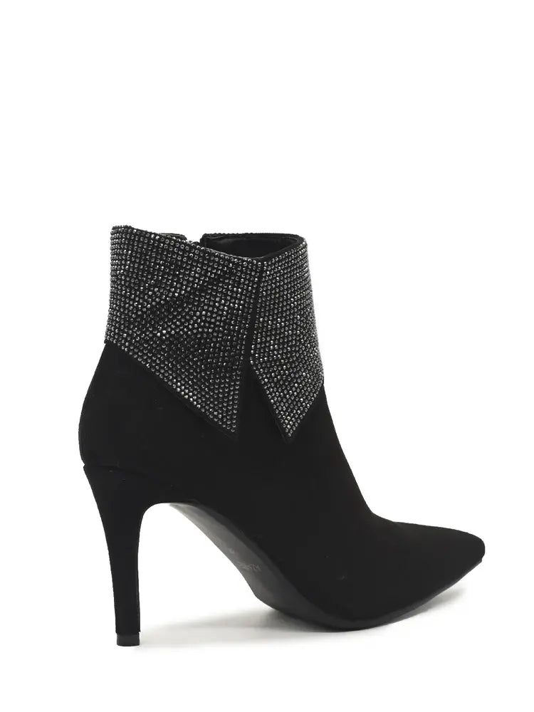 Zwarte Enkellaarsjes suedine met Strass en sluiting doormiddel van zwarte rits aan binnenzijde, Verkrijgbaar vanaf maat 36 t/m 41. Musthave Laarsjes voor de komende Feestdagen