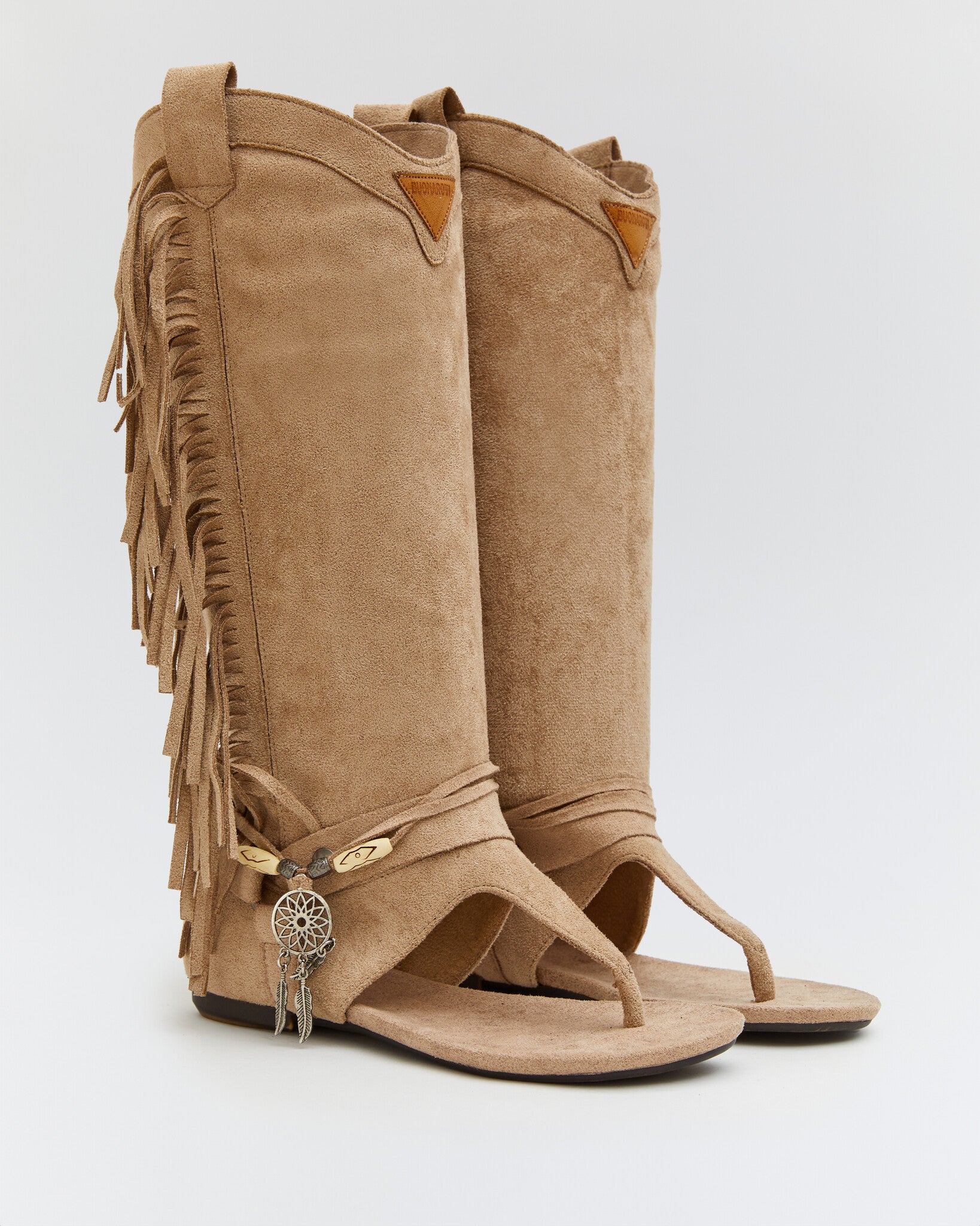 Hoge Ibiza Sandalen Beige Suedine Franjes