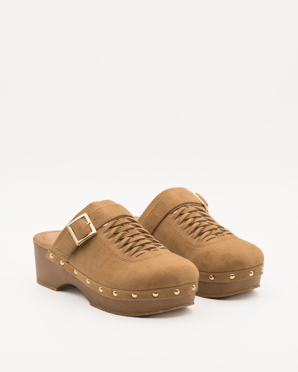 Ontdek een nieuwe dimensie van stijl en comfort met deze nieuwe trendy dames klompen. Deze tijdloze instap klompen in camel suedine, zijn afgewerkt met gouden gesp, vlecht details op de vreef en versterkt met een elegante blokhak. Ze zijn een onmisbaar paar voor elke vrouw die haar schoenencollectie wil verrijken met veelzijdige trend.